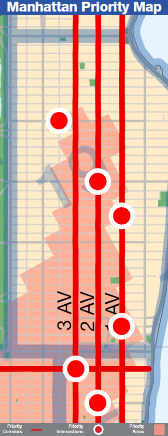 Following the report, the DOT and NYPD also released a Vision Zero Borough Pedestrian Safety Plan for Manhattan. They included included priority corridors on 1st, 2nd and 3rd Ave as well as intersections from my report: Lexington Avenue and East 86th Street, 2nd Avenue and East 79th Street, East 75th Street and 1st Avenue, East 62nd Street and 1st Avenue, 3rd Avenue and 57th Street, and 2nd Avenue and East 53rd Street.