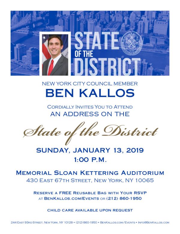 On January 13, please join me for my annual report to you on the State of our District, recognizing all the work my office and members of our community have done together over the past 5 years and giving a preview of what’s in store for 2019. There will be fresh bagels and coffee available to attendees. If you are in need of childcare, please RSVP and it will be provided on-site at no cost. FREE reusable Ben Kallos bags will also be given out at the end of the event.