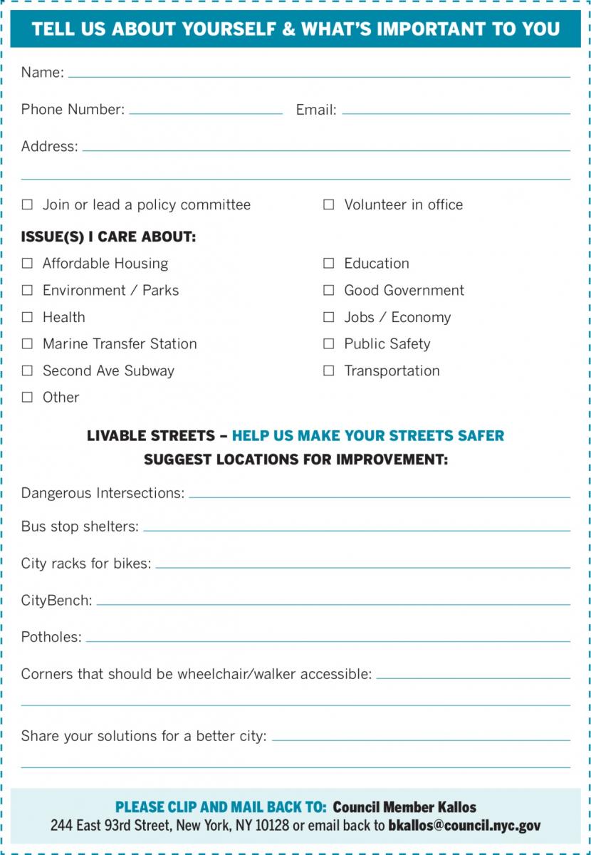 Residents were encouraged to report dangerous intersections or streetscape improvements by contacting his office, visiting BenKallos.com/Livable-Streets, or filling out this form which was mailed to 60,000 households in the district.
