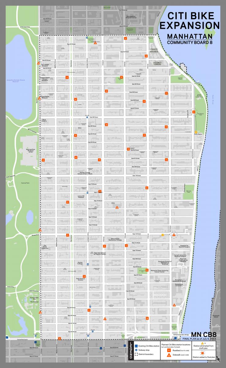 The Upper East Side is slated to receive CitiBike bike share in the Summer of 2015. Following community input a draft plan has been released with opportunity to comment closing in the first weeks of June 2015. We worked with the community, receiving extensive feedback on the draft plan for a final planned bike share system that I hope will benefit the community.