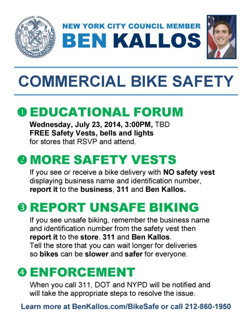 Safe biking is a top concern for pedestrians, motorists and cyclists alike. We held three forums on the issue and launched a Commercial Bike Safety program to educate and provide commercial cyclists with free safety vests, lights and bells. The program empowers you to call 311 and my office if you see commercial bikes, biking dangerously, or without vests, lights, bells, or identification numbers. In the warmer months, we will increase education and enforcement.